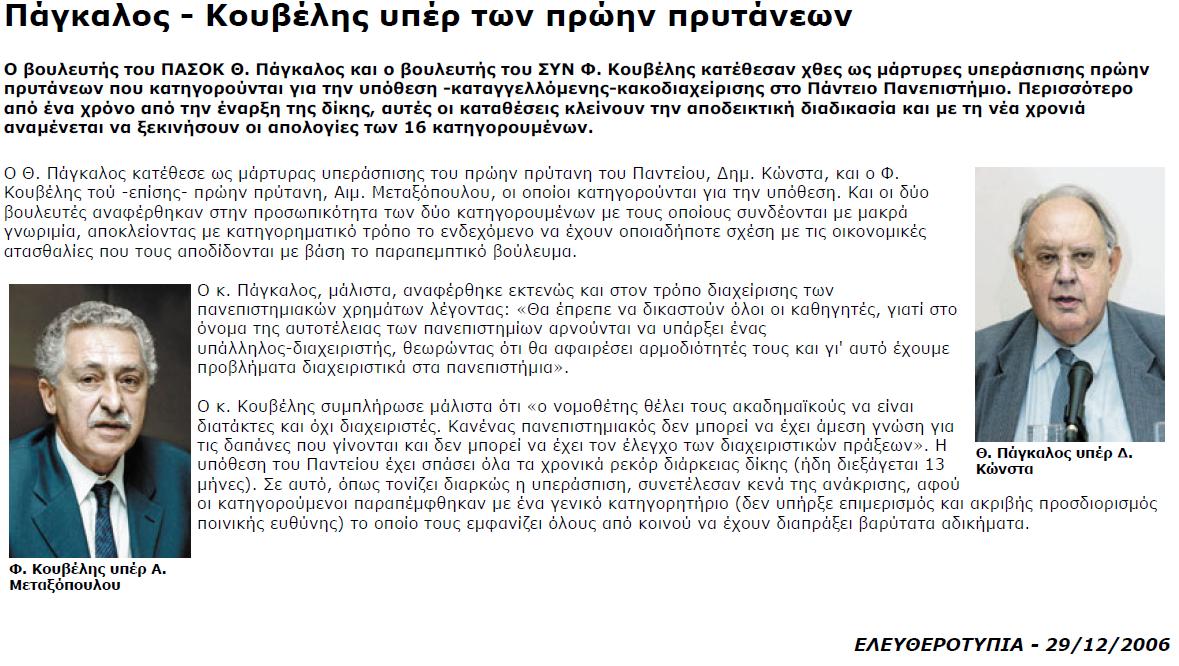 Έτος 2012. Η δίκη της πράσινης συμμορίας της Παντείου. 14 χρόνια μετά το σκάνδαλο. Οι δύο ηρωϊκοί Έλληνες, ο πρύτανης Ηλίας Σιδηρόπουλος και ο αντιπρύτανης οικονομικών Ονούφριος Φαρμακίδης που έχουν αποκαλύψει το σκάνδαλο, δεν ζουν πια.