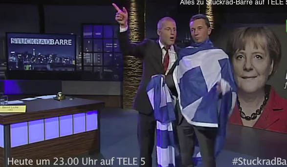 Στο τρέιλερ της εκπομπής του Μπέντζαμιν Στούκραντ – Μπάρε, εμφανίζεται ο παρουσιαστής να κρατά μια ελληνική σημαία με τρύπα στη μέση και να ρωτά τον κ. Λούκε «τι θα κάνουμε απόψε;», για να απαντήσει ο Γερμανός πολιτικός «θα με τυλίξουμε με την ελληνική σημαία».