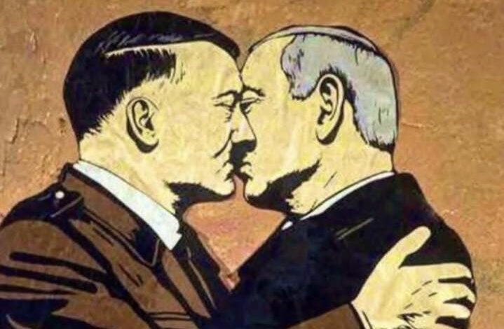 Ο πίνακας έχει τίτλο «Η Τελική Λύση» και απεικονίζει τον Ναζί δικτάτορα Χίτλερ να συγχαίρει τον καταζητούμενο από το Διεθνές Δικαστήριο Ισραηλινό πρωθυπουργό για τη γενοκτονία στη Γάζα και να τον φιλάει.