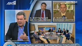 Στην εκπομπή “Πρωϊνό ant1” βρέθηκαν σήμερα οι Π. Καμμένος και Δ.Καζάκης, σε μια συζήτηση που αφορούσε τους οίκους αξιολόγησης, τους δανειστές μας που τοποθετούν “Στρατηγό” πάνω απ’ την Ελλάδα και τις διάφορες μορφές κερδοσκοπίας που χρησιμοποιούν τα απρόσωπα χρηματοπιστωτικά ιδρύματα.
