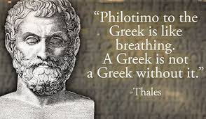 Τελευταία γίνεται πολύς λόγος για το Ελληνικό φιλότιμο. Φιλέω-τιμή η ομηρική φιλοξενία της τιμής. Δηλαδή, το πρώτιστο αξίωμα ότι όλα ξεκινούν από αγνό αλτρουισμό απαλλαγμένο από την λέξη συμφέρον. Πρώτο και κύριο συστατικό του Ελληνικού πνεύματος. Μπορεί ο Έλληνας να μιλούσε με εκατό λέξεις σ’ όλη του τη ζωή όμως η μία από αυτές πάντα ήταν το φιλότιμο. Βιωματική η έννοιά της και μέσα της κρύπτονται όλα τα αγνά και ευγενή συναισθήματα.
