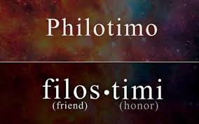 Τελευταία γίνεται πολύς λόγος για το Ελληνικό φιλότιμο. Φιλέω-τιμή η ομηρική φιλοξενία της τιμής. Δηλαδή, το πρώτιστο αξίωμα ότι όλα ξεκινούν από αγνό αλτρουισμό απαλλαγμένο από την λέξη συμφέρον. Πρώτο και κύριο συστατικό του Ελληνικού πνεύματος. Μπορεί ο Έλληνας να μιλούσε με εκατό λέξεις σ’ όλη του τη ζωή όμως η μία από αυτές πάντα ήταν το φιλότιμο. Βιωματική η έννοιά της και μέσα της κρύπτονται όλα τα αγνά και ευγενή συναισθήματα.